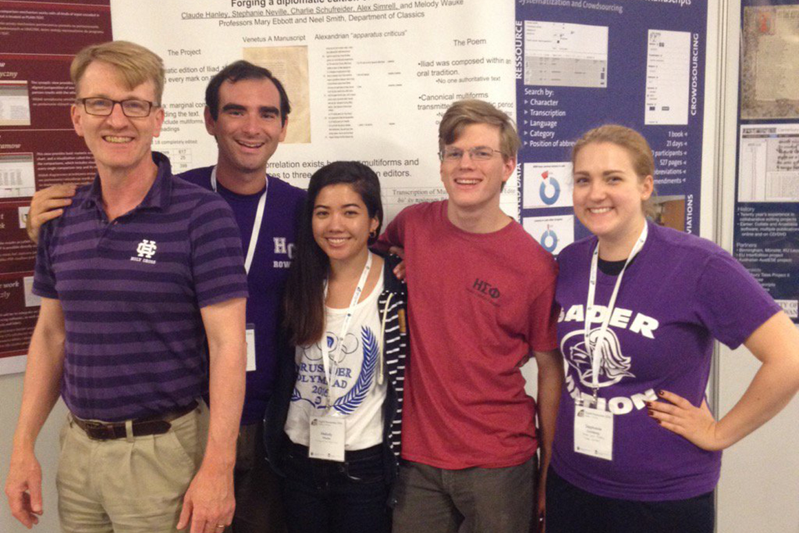 From left, Professor Neel Smith, Brian Clark '15, Melody Wauke '17, Claude Hanley '18, and Stephanie Lindeborg '13 present their research on the Venetus A manuscript of the "Iliad" at the International Digital Humanities conference in Krakow, Poland in July 2016.