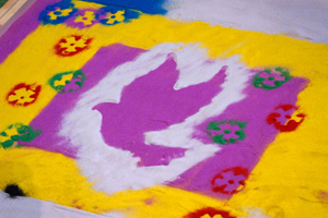 Interpreting a Catholic tradition popular in Latin America, art students at Holy Cross created a carpet of colored sand leading to the steps of the St. Joseph Memorial Chapel for Palm Sunday. Their intricate designs feature "creatures with wings" — angels, insects, a phoenix, dove and other birds, along with crosses and abstract patterns. Learn more.